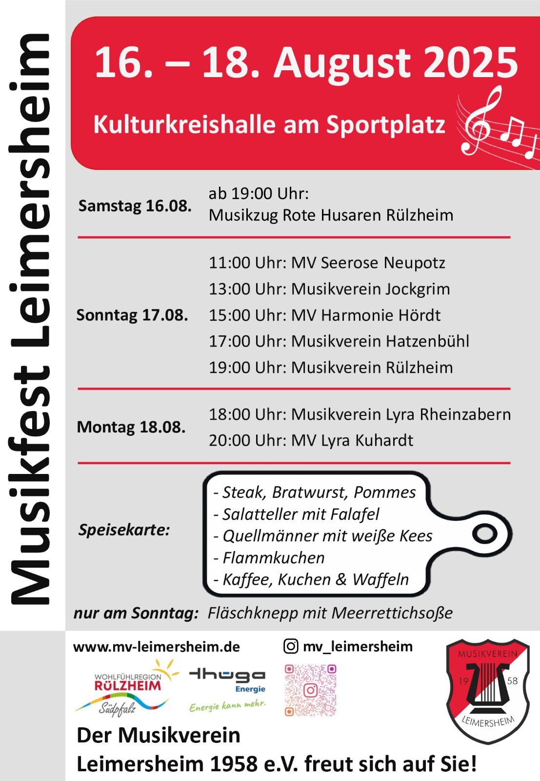 Musikfest 2025![]() Neuer Kurs: Musikalische Früherziehung![]() Musik begeistert, fördert und verbindet - und das schon im frühen Kindesalter! Deshalb startet der Musikverein Leimersheim nach den Sommerferien 2025 einen neuen Kurs zur musikalischen Früherziehung für Kinder ab 4 Jahren. In einer liebevollen und spielerischen Atmosphäre entdecken die Kinder gemeinsam die Welt der Klänge, Rhythmen und Lieder. Neben dem Singen, Tanzen und Musizieren mit einfachen Instrumenten stehen auch Motorik, Sprache und soziales Miteinander im Fokus - eine ideale Grundlage für jede musikalische Entwicklung! Wann? Der Kurs findet ab September 2025 immer dienstags um 8:30 Uhr statt. Wo? In den Räumlichkeiten der betreuten Grundschule Infoabend für interessierte Eltern: Am 21.08.2025 um 17:30 Uhr laden wir herzlich zu einem unverbindlichen Informationsabend in den Musikpavillon ein. Dort erfahren Sie alles rund um den Kurs, die Inhalte und die Anmeldung. Wir freuen uns auf kleine Musikentdecker - und auf Sie! Der Musikverein hat jetzt einen eigenen Instagram-Kanal!![]() Ab sofort findet ihr uns mit einem eigenen Kanal auf Instagram unter @mv_leimersheim. Dort gibts regelmäßig aktuelle Informationen, Einblicke hinter die Kulissen und aus dem Vereinsleben. Ob Proben, Auftritte, Ausflüge, Veranstaltungen oder sonstige besondere Momente, mit unserem Instagram-Kanal seid ihr immer dabei wie als wären ihr dabei. Am einfachsten findet ihr uns, indem ihr den beigefügten QR-Code scannt oder direkt auf Instagram nach mv_leimersheim sucht und uns folgt. Natürlich werden wir euch auch weiterhin über alle wichtigen Themen und Termine, wie zum Beispiel unserem Musikfest vom 16. bis 18. August 2025, hier auf der Webseite sowie im Heimatbrief ausführlich informieren.Jugendausflug MVL: Paddeltour & GrillenAm Samstag, den 24.05.25, fand der diesjährige Ausflug der Jugend des Musikvereins und ihren Betreuern bei bestem Wetter statt.Gestartet sind wir am Bootshaus des Freizeitclubs Leimersheim, gut ausgerüstet mit Schwimmwesten, Keksen und Saftschorlen. In fünf vollbesetzten Kanus ging unsere Paddeltour los, vom Bootshaus über das Fischmal, einmal um die Fontäne, dann ein Stückchen den Michelsbach hoch und wieder zurück. Dabei sorgten die schöne Natur, kleine Wettrennen oder Pausen, bei denen sich alle Boote versammelten für viel Unterhaltung. Anschließend sind wir zur Hütte des Pfälzerwaldvereins gewandert. Dort wurden wir mit bereits fertig gegrillten Bratwürsten und Gemüsebratlingen begrüßt und die Rasenfläche bei der Hütte wurde sofort zu einem großen Spielplatz umgewandelt. Klassische Spiele wie Fangen oder der gordische Knoten kamen super an. Aber auch neuere Spiele wie "Cornhole", bei dem man kleine Maissäckchen in ein Loch einer Holzplatte wirft, sorgten für Spaß. Wir bedanken uns beim Freizeitclub für das Bereitstellen der Kanus und beim Pfälzerwaldverein für das Zurverfügungstellen der Hütte!