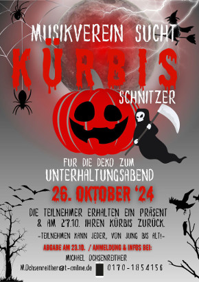 Neugründung einer Schülerkapelle beim Musikverein LeimersheimDer Musikverein Leimersheim startet in der Jugendarbeit in eine neue Ära: Eine Schülerkapelle wird gegründet.Damit möchte der Verein junge Talente fördern und Kindern sowie Jugendlichen die Möglichkeit geben, ihre Begeisterung für Musik gemeinsam auszuleben. Die Nachwuchsformation soll nicht nur musikalische Fähigkeiten vermitteln, sondern auch Teamgeist und Freude an der Gemeinschaft stärken. Zur Vorbereitung der Neugründung lädt der Musikverein alle interessierten Kinder, Jugendlichen und deren Eltern herzlich zu einem Infoabend ein. Dieser findet am Freitag, 4. April um 18 Uhr im Musikpavillon statt. Hier werden alle Fragen rund um die Schülerkapelle beantwortet und über Ablauf und Organisatorisches informiert. Außerdem sollen Probetag und -rhythmus besprochen werden, sodass sich die musikalischen Aktivitäten gut mit Schule und Freizeit verbinden lassen. Zielgruppe für die Schülerkapelle sind insbesondere Schülerinnen und Schüler des Blasmusiklehrgangs ab dem Abzeichen Junior, doch auch alle anderen Musikbegeisterten sind herzlich eingeladen, teilzunehmen. Maximilian Huber, der die Leitung übernimmt, bringt nicht nur Erfahrung, sondern auch viel Enthusiasmus mit, um die jungen Musikerinnen und Musiker auf ihrem Weg zu begleiten. Der Musikverein Leimersheim freut sich darauf, mit der Schülerkapelle eine neue Generation von Musikern zu begrüßen. Kommen Sie vorbei, schnuppern Sie rein und werden Sie Teil dieses spannenden Projekts. Weitere Informationen erhalten Sie beim Infoabend oder direkt beim Verein. Wer will ein Musikinstrument spielen lernen?Der Musikverein lädt ein: Infoveranstaltung am Sonntag, 08.12.2024![]() Der Musikverein Leimersheim lädt deshalb alle Interessierten am kommenden Sonntag, den 08.12., um 17:30 Uhr in den Musikpavillon an der Hugo-Dörrler-Halle ein. Bei dieser Infoveranstaltung besteht die Möglichkeit, die Welt der Blasmusik kennenzulernen: von der eleganten Querflöte über das kraftvolle Schlagzeug bis hin zur beeindruckenden Tuba - alle Instrumente des Vereins können unter Anleitung erfahrener Musikerinnen und Musiker ausprobiert werden. Alle sind herzlich eingeladen, ihre ersten Töne zu spielen. Es werden Informationen zum Blasmusiklehrgang und zur Jugendarbeit im Musikverein gegeben. Wer vorab Fragen hat oder an dem Abend verhindert ist, darf sich gerne per E-Mail an unsere Vereinsvorsitzenden wenden (vorsitzende@mv-leimersheim.de). Wir freuen uns darauf, viele neue Gesichter kennenzulernen und vielleicht schon bald neue Mitglieder in unserem Verein willkommen zu heißen. Musikverein meets HalloweenUnterhaltungsabend am 26. Oktober![]() An diesem Abend verwandeln wir die Halle in ein kleines Spukhaus. Ober-Hexenmeister Klaus Gehrlein und sein Grusel-Ensemble proben dafür seit Wochen die passende Musik. Zu hören sein werden unter anderem Melodien zu Dracula, Tanz der Vampire, Addams Family, aus Horrorfilm-Klassikern wie Psycho und vieles mehr. Die Musik alleine wird allerdings nicht im Vordergrund stehen. Es erwartet Sie auch ein kleines Rahmenprogramm, bei dem Sie teilweise zum Mitmachen aufgerufen sein werden und es auch etwas zu gewinnen gibt. Und selbstverständlich dürfen Sie sich immer mal wieder etwas gruseln. Für Ihr leibliches Wohl haben wir auch gesorgt. Passend zum Motto gibt es eine Kürbissuppe, aber auch noch andere Speisen und Getränke an unserer Horror-Bar. Für Süßes oder Saures lädt unsere Candy Bar ein. Alle Gäste, die passend kostümiert erscheinen, erhalten zur Begrüßung ein Glas Sekt. Die schönsten Kostüme werden prämiert. Eintrittskarten (8,00 EUR, Kinder bis 10 Jahre frei) gibt es im Vorverkauf bei allen Musikerinnen und Musikern sowie an der Abendkasse. Wir freuen uns auf einen schauerlich-schönen Abend mit Ihnen. Kürbis-Schnitzer gesucht![]() Mitmachen kann jeder, von jung bis alt. Auch die Größe und Form des Kürbisses spielt keine Rolle. Wir freuen uns über jeden Kürbis und jede/n die/der ihn schnitzt. Die Abgabe der kleinen Kunstwerke erfolgt am 23.10.2024. Alle Teilnehmer erhalten ein kleines Dankeschön und ihren Kürbis am 27.10. zurück. Dieser wird allerdings passend zu den Farben unserer Dekoration besprüht und wird daher nicht mehr ganz im Originalzustand sein. Zur Planung bitten wir um eine kurze formlose Anmeldung. Anmeldung und Infos bei Michael Ochsenreither, per E-Mail: m.ochsenreither@t-online.de oder Handy/Whatsapp: 0170 1854156. Afterwork PartyAm 05.07., ab 17 Uhr, Bürgerhaus in Leimersheim